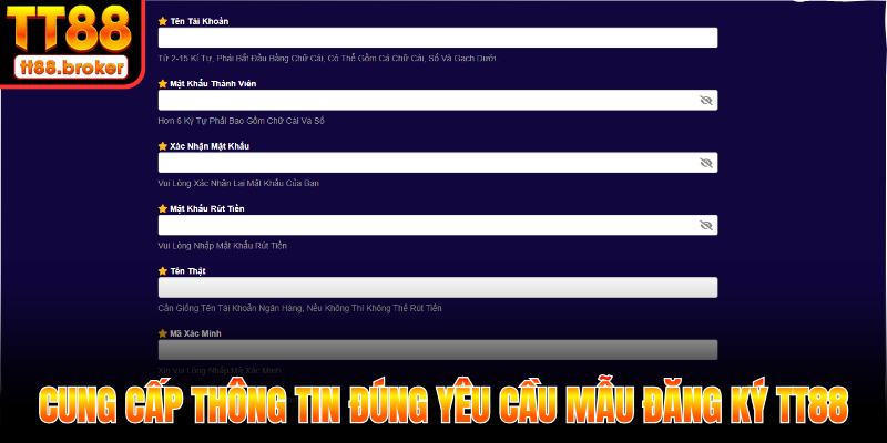 | Xác nhận mật khẩu | Nhập lại mã khóa muốn sử dụng làm mật khẩu đăng ký TT88 | Boypho203 |