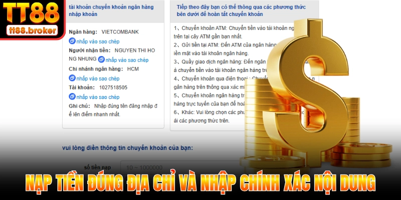 Nạp tiền đúng địa chỉ và nhập chính xác nội dung